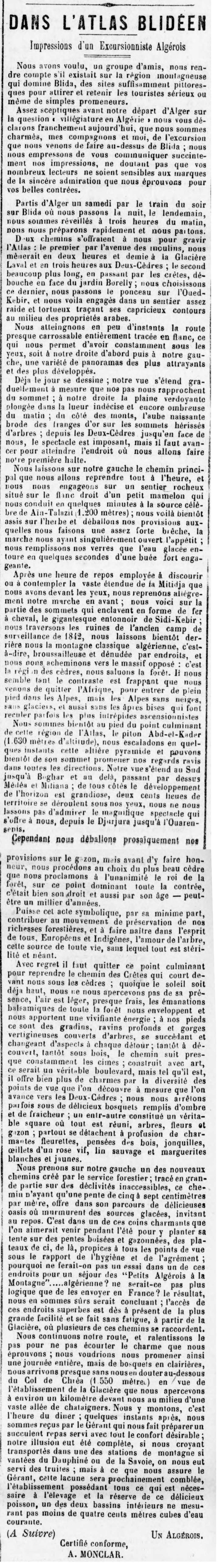 Partir de la Place d'Armes, remonter la rue Tirman, pénétrer dans l'avenue des Moulins. A une cinquantaine de mètres à peine, tourner à gauche par un chemin qui longe tout d'abord des villas, puis qui se libère, pique vers la montagne par une rampe assez raide, et s'élève peu à peu au-dessus de la ville. Ce chemin est dit route des Glacières. Il aboutit au col de Chréa, lieu d'excursion réputé, à 22 kms de Blida. On ne saurait en effet en recommander de meilleure, offrant de plus merveilleux points de vue. A mesure que l'on s'élève, le regard s'étend sur la plaine. L'horizon s'agrandit. A trois kilomètres, c'est déjà tout un panorama qui se déploie aux pieds du voyageur: toute la vaste plaine de la Mitidja, les figures géométriques dessinées par les propriétés, les longues lignes des plantations, le damier blanc et bleu de Blida. Puis la route carrossable tourne, grimpe hardiment à flanc de montagne, parfois encaissée entre les talus, parfois bordée de ravins, ou débouchant en terrasse et comme coupée sur l'infini. Bientôt on atteint la région boisée. Et voici les Glacières (1.210 m., 20 km.). Jadis, c'est-à-dire jusqu'à 1931 un Hôtel hospitalier s'abritait au milieu d'un bois de pins. La ville de Boufarik a acheté l'hôtel, le domaine, ses dépendances et les a convertis en camp pour ses « enfants à la montagne ». Un vaste bassin où le ciel se mire entretient en été une fraîcheur constante. L'endroit tire son nom des silos où l'on conservait autrefois la neige tombée pendant l'hiver. Les riches rhaïs de Blida ou d'Alger, tout comme le commun des mortels aimaient se rafraîchir. On transportait donc à dos de mulet cette neige de conserve, ce qui d'ailleurs la rendait assez chère, la moitié de la charge fondant en route. A partir des Glacières la route s'engage dans les hauteurs boisées. On atteint rapidement Chréa, 1.550 m. La station de Chréa est à la fois station d'hiver et station d'été. Station d'hiver, elle offre aux amateurs de ski des pentes agréables, aux simples promeneurs, une atmosphère vivifiante, tonique. Le Ski Club Algérien y a fait élever un refuge important inauguré officiellement en Février 1930. Station d'été, elle offre le charme de paisibles flâneries sous les cèdres, sur les hauteurs, dans les vallons, un air plus frais que dans la plaine, le calme des sommets. Le nombre croissant des chalets prouve son succès auprès des estivants. Plusieurs hôtels confortables, d'accès facile permettent et encouragent le séjour. Des services d'autobus nombreux assurent des relations rapides avec Blida. L'eau d'alimentation, captée à la source de Kerrach, est amenée à la station par refoulement. Petite Norvège africaine, l'hiver, Chréa devient, l'été une oasis de fraîcheur et un admirable belvédère. On y embrasse un spectacle unique, un panorama d'avion : Au nord-ouest, c'est le massif du Zaccar, le mont Chenoua massif, la baie de Tipasa,le fameux Tombeau de la Chrétienne. Au nord, l'immensité bleue de la Méditerranée sert de toile de fond aux coteaux de Bou-Smaïl, de Koléa, à l'embouchure du Mazafran. Au nord-est s'allongent les coteaux du Sahel, Staouéli, Sidi-Ferruch, Guyotville... A l'est se dresse le massif du Djurdjura, au sud les monts échelonnés de l'Atlas. Le Syndicat d'Initiative se préoccupe de l'installation d'une table d'orientation, et de l'érection d'une tour belvédère, avec le concours des Amis de Chréa. Assurément plus nombreux que les fameux cèdres du Liban, les cèdres de Chréa épandent le soir dans l'air calme leur parfum balsamique. Et rien n'est plus beau que la descente en auto sur Blida quand le ciel reste encore clair au-dessus des montagnes noyées d'ombre.