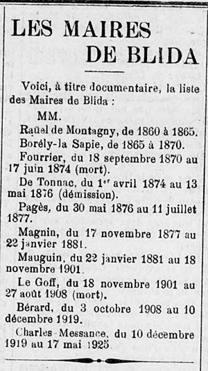 Un arrêté du Gouverneur Général de l'Algérie en date du 1 octobre 1840, appela à Blida 300 familles européennes qui furent le noyau de la nouvelle population. |