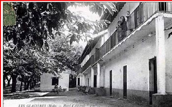 Le long du sentier qui menait des Glacières à CHRÉA, on pouvait voir encore les bases de ces glacières creusées dans le sol. Dès les premières chaleurs dans la plaine, 4 tonnes de cette glace étaient transportées chaque jour, à dos de mulets à BLIDA et jusqu'à ALGER par d'autres moyens. Je me souviens encore de ma première montée aux Glacières, pendant l'été 1916, bien calé dans l'une des poches du chouari fixé sur le dos d'un mulet, les bagages faisant contre poids dans l'autre poche. L'hôtel des Glacières était tenu, à l'époque, par M. CASTAN. C'est à peu près à cette date que fut ébauchée la route carrossable par une main d'oeuvre composée en majeure partie de prisonniers allemands. En 1923, cette route aboutissait aux Glacières.