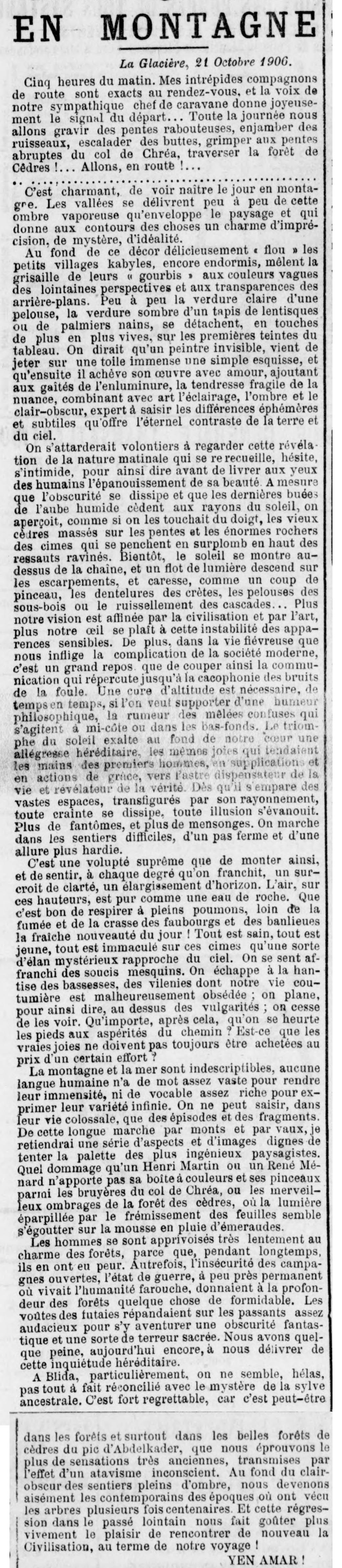 A propos de la Glacière, Ernest Mallebay écrit dans "Cinquante ans de journalisme" : Dans la montagne: ...... Quand, de la Glacière, on montait, par une piste en lacets jusqu'à la forêt des Cèdres et qu'on y était arrivé, il était impossible de n'être pas frappé par la beauté sauvage de ces solitudes silencieuses. On se sentait vivifié par l'air balsamique qui palpitait sous les dômes de ces arbres vénérables et charmé par l'immensité du panorama qui se déroulait aux pieds de l'excursionniste. C'est toute la plaine de la Mitidja qu'il embrassait d'un seul regard avec, comme toile de fond, la Méditerranée d'un bleu cru.