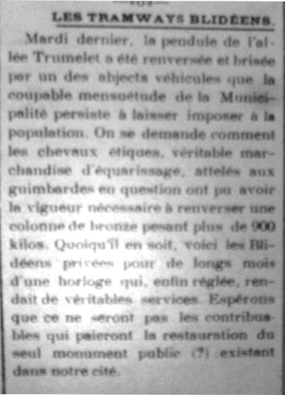 Pourtant, si l'on en croit l'article de Pierre Cazenave de mai 1911, les premières actions entreprises pendant l'hiver précédent semblent avoir eu quelques effets bénéfiques mais de courte durée car dès 1914 le problème est à nouveau soulevé. Dans la chronologie des évènements et dans les documents retrouvés, on note qu'au moment du goudronnage du boulevard au mois d'août 1921, la gène possible causée aux orangers est à nouveau posée. Pour en savoir un peu plus sur la suite des évènements, laissons la parole à Ernest Mallebay qui raconte, dans "Cinquante ans de journalisme", son arrivée à Blida en 1880 et nous parle des orangers, de leur remplacement par des frènes et finalement la plantation des bigaradiers que nous avons connus. |