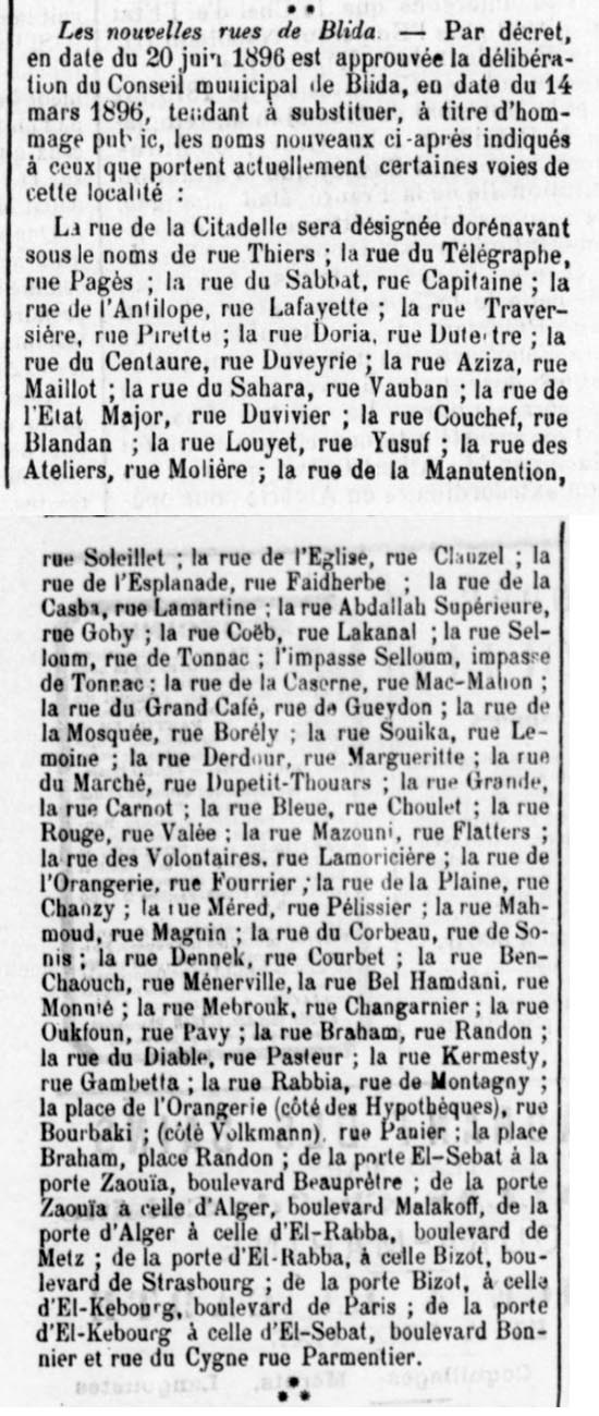 Nom des rues à Blida après l'arrêté du 20/06/1896 Un plan de 1840 établi par le génie Noms des rues à Blida après l'arrêté du 28 avril 1937 Evolution du nom des rues à Blida Le plan de la rue Fourrier par B. Nemiri Commerces autour du marché européen Par B.Nemiri Un petit tour au marché un jour de 1946 Plan de la Place d'Armes (années 50/60) |