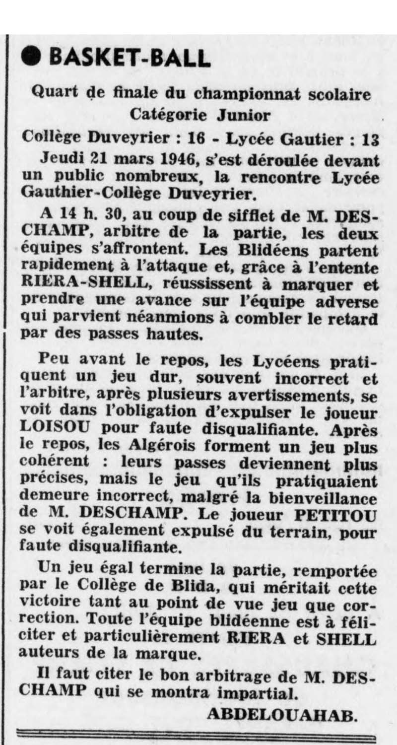 Amies blidéennes, amis blidéens, vous avez pratiqué le basket et vous avez sûrement des souvenirs à nous faire partager; n'hésitez à envoyer toutes vos informations au WEBMASTER (adresse page d'accueil), je me ferai un plaisir de les publier sur le site. Vous pouvez aussi corriger ou compléter les photos ci-dessous. |