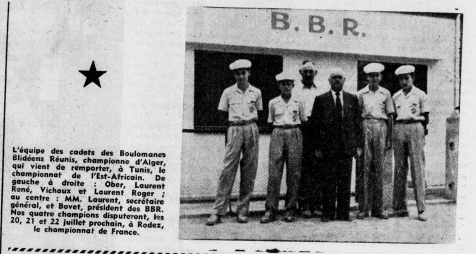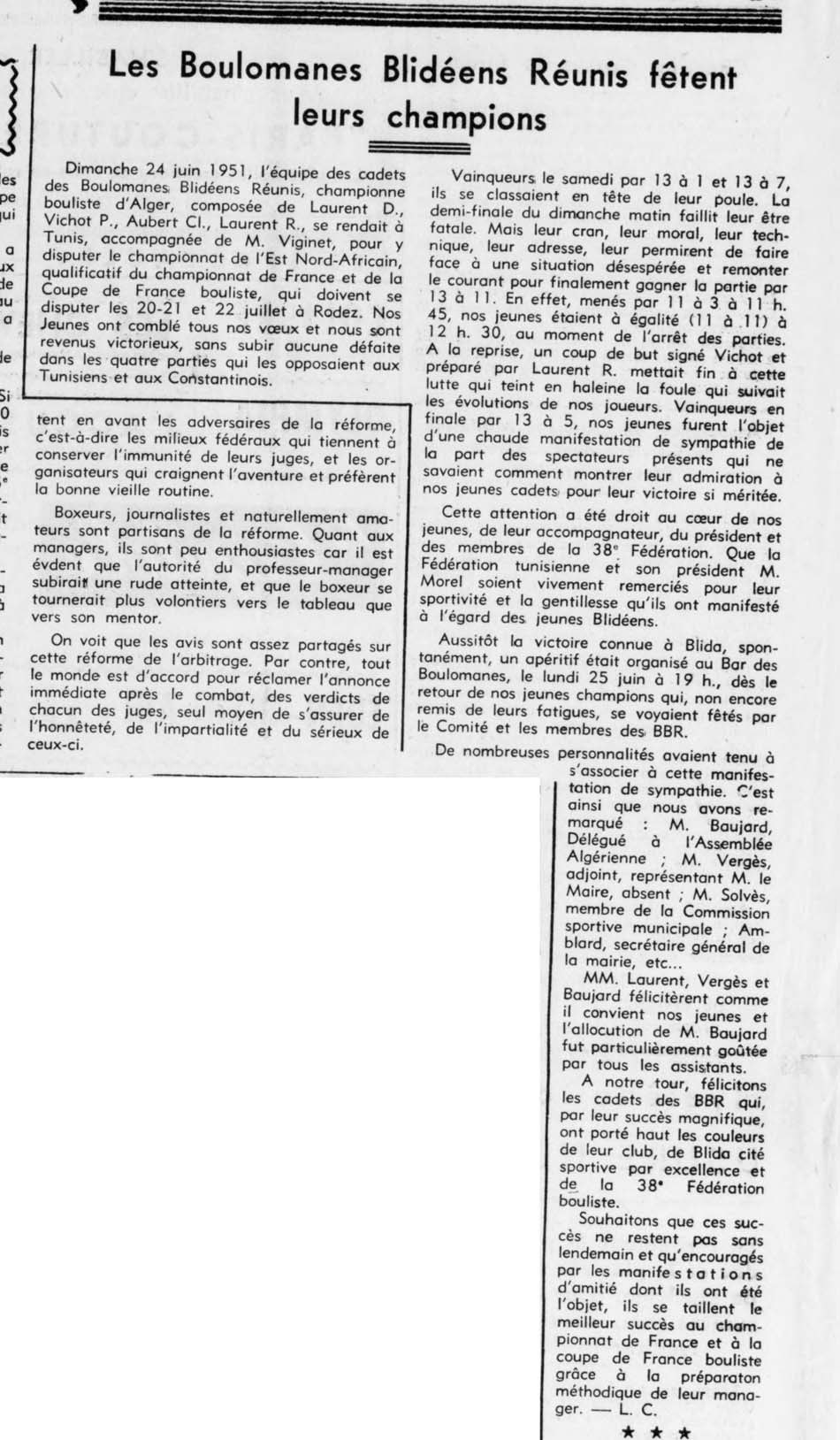 C'est avec juste raison que la Fédération bouliste nord-africaine a choisi la ville de Blida pour y faire dérouler, dans le magnifique jardin du "Bois sacré", le championnat de France. Dès la première heure les délégations métropolitaines et nord-africaines furent réunies en présence de Mr Gueran, maire de la ville, au monument aux morts où fut déposée une gerbe. Le Nedjma clique prêtait son concours à cette manifestation qui avait attiré un public dense. A 8h30 les participants firent leur entrée sur le terrain du concours où ils reçurent un souvenir de la part de Mr Bovet, président des Boulomanes B R. L'organisation peut être classée comme une des meilleures, et la satisfaction exprimée par les différentes délégations, ainsi que par les spectateurs, fait honneur aux dévoués dirigents de la Fédération. Du côté du jeu, les parties furent agréables à suivre, étant donné la valeur des compétiteurs et aussi l'attrait unique de cette manifestation, le titre national. Une foule intéressée^par les exploits des joueurs français ne manqua pas de les applaudir dans leurs actions suivies et supérieures. La présence des journalistes, Girbon et Vesien du "Provençal" , Chaillot du "Midi Libre", Ferrara de "Sprinter", Command Manier de la "République de Toulon" montre l'importance de cette manifestation