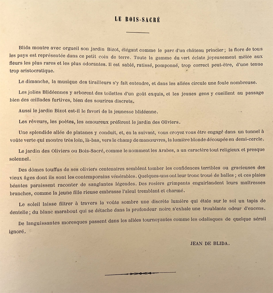 l'Algérie illustrée Remerciements à Jacques B. et Louise P. qui ont déniché ces textes, ces gravures et ont voulu nous en faire profiter. Ces textes sont signés d'un certain Jean de Blida , pseudonyme qui, il me semble, cache le nom de Ernest Mallebay. L'Algérie illustrée est l'organe officiel du Syndicat d'initiative d'Alger et de la Fédération des syndicats d'initiative d'Algérie. Vous pouvez retrouver la totalité de la collection sur Gallica https://gallica.bnf.fr/ark:/12148/cb326854746/date